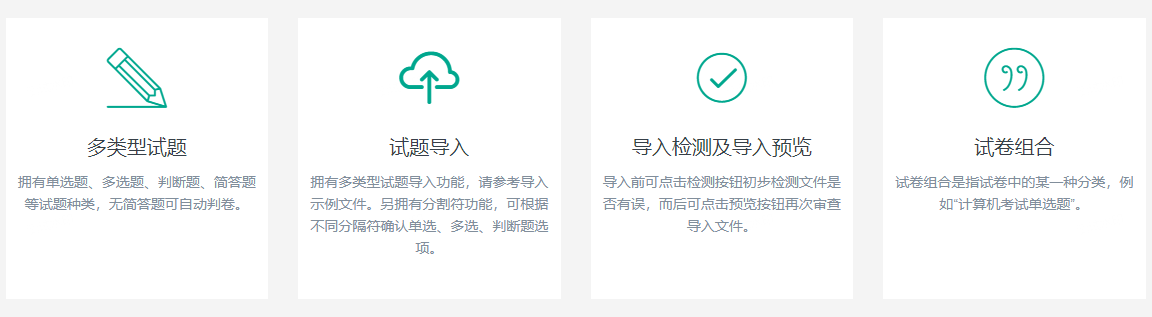 Web线上考试系统,是一款H5手机端的考试系统,支持试题批量导入,拥有单选题、多选题、判断题、简答题等试题种类,支持线上课程、答题练兵、错题收集、模拟考试、自动判卷。